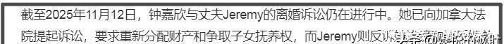 钟嘉欣和加拿大丈夫Jeremy的离婚案最近闹上法庭。两人结婚十年,有三个孩子,现在钟嘉欣起诉要重新分财产和争抚养权,对方反过来告她诽谤,说她违反婚前协议。这事儿让很多人没想到,毕竟钟嘉欣婚后专心带娃,今年刚复出工作。